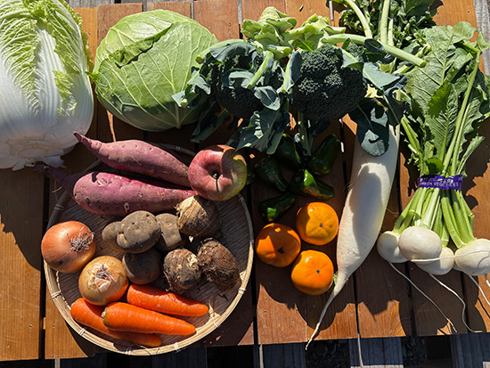 大玉キャベツ・白菜・ブロッコリー・大根・かぶ・にんじん・さつまいも・じゃがいも・玉ねぎ・ピーマン・りんご・柿