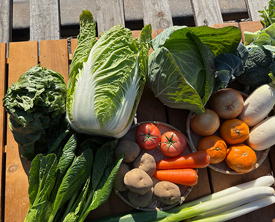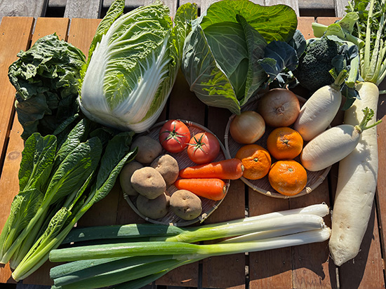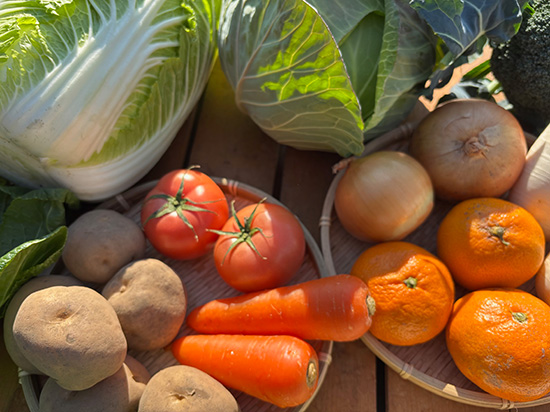 白菜・キャベツ・大根・ブロッコリー・小松菜・長ねぎ・人参・じゃがいも・玉ねぎ・トマト・みかん ほか