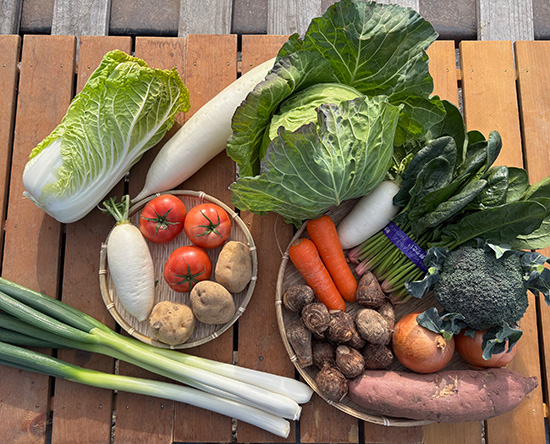 白菜・キャベツ・大根・人参・玉ねぎ・じゃがいも・長ねぎ・ほうれん草・ブロッコリー・トマト・里芋・さつまいもなど