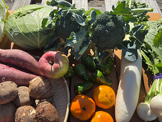 大玉キャベツ・白菜・ブロッコリー・大根・かぶ・にんじん・さつまいも・じゃがいも・玉ねぎ・ピーマン・りんご・柿