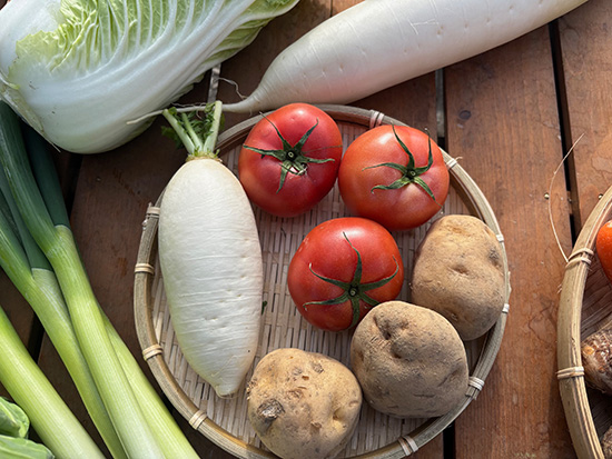 白菜・キャベツ・大根・人参・玉ねぎ・じゃがいも・長ねぎ・ほうれん草・ブロッコリー・トマト・里芋・さつまいもなど